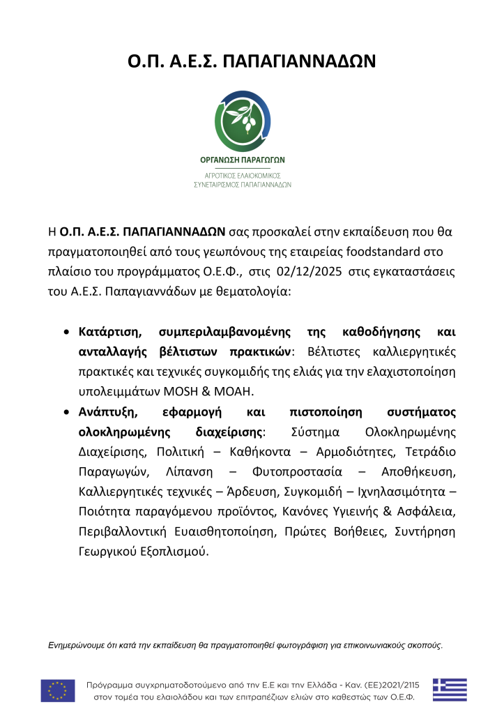 Εκπαίδευση παραγωγών – μελών της Ο.Π. Α.Ε.Σ. Παπαγιαννάδων στο πλαίσιο του 2ου έτους εφαρμογής του εγκεκριμένου προγράμματος εργασίας Ο.Ε.Φ. περιόδου 2021 – 2022 για τις Δράσεις Βii – Πιλοτική ανάπτυξη και εφαρμογή συστήματος λίπανσης & Βiv- Ανάπτυξη, εφαρμογή & πιστοποίηση Συστήματος ολοκληρωμένης διαχείρισης σε ελαιοπαραγωγούς της Ο.Ε.Φ.. Η εκπαίδευση θα πραγματοποιηθεί στην αίθουσα του Α.Ε.Σ. Παπαγιαννάδων στις 19:00 .